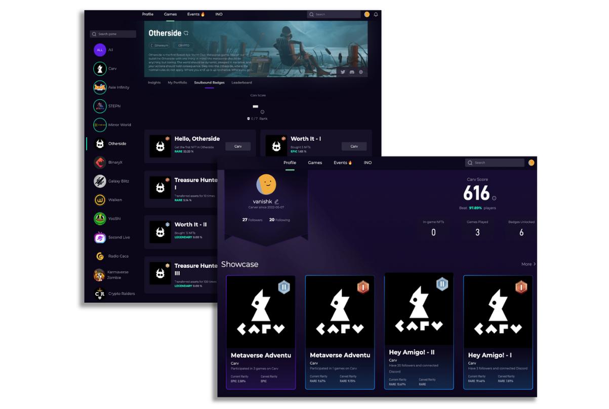 Carv是一个从成就系统切入的GameID平台,非常有意思的是其会根据用户过往的链上数据,计算出用户的声誉分。其整体GameID的呈现也是以这个声誉分数+领取的SBT进行呈现。平台会抓取链上数据对用户达成的成就进行验证,满足条件后则可领取对应的灵魂代币(SBT)。