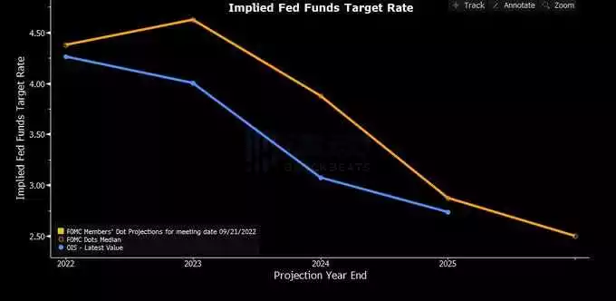 那市场(蓝色)对如此激进的点阵图(橙色)是否买单呢?