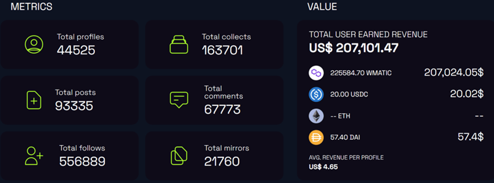 Lens Protocol 于 2022 年推出,由于社交网络产品的革命性和开发它的知名 Aave (AAVE) 团队,它在区块链和加密社区中获得了很多关注。作为以太坊生态系统中重要的贷款平台之一的分支,Lens Protocol 寻求解决当前社交媒体环境中的重大缺陷,它做得非常成功,逐渐获得 Web3.0-ready 社区专用用户的基础。截止到 5 月底 Lens Profile NFT 铸造总数为 44,525,总发帖数 93,335,基于 Lens 协议搭建的应用达到 9 个,目前暂未发币,其它各项数据如下图所示: