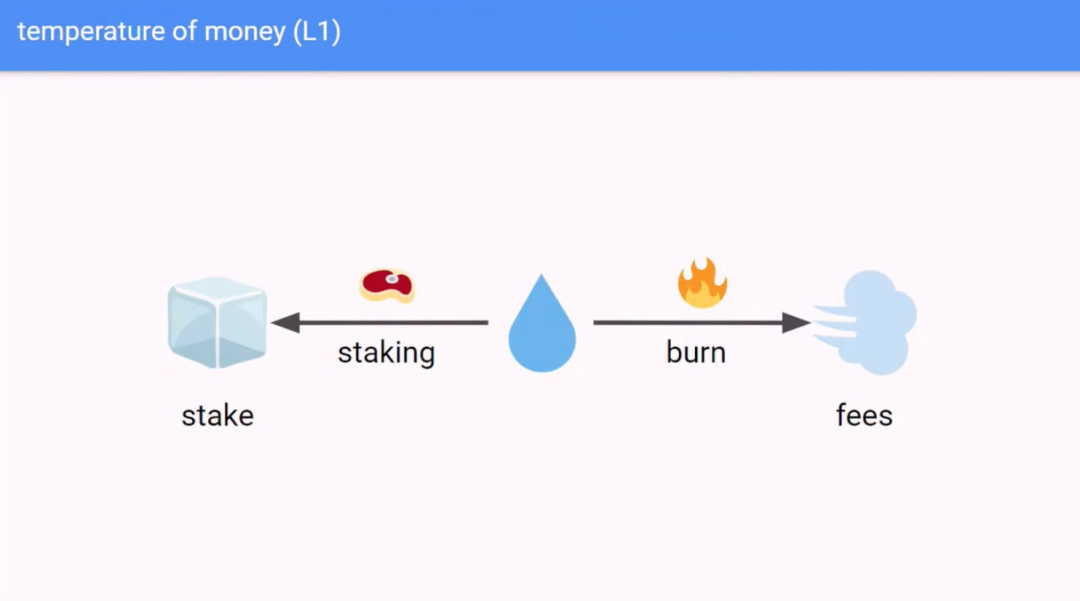 Justin 用货币温度(流通速度)来做比喻。在一层网络,质押就像将货币从液态冻结成固态,gas 燃烧则像从液态变成气态,快速消耗。在二层网络,情况类似,ETH 可以在 DeFi 里绑定作为抵押品,ETH 也可以在交易中作为货币。