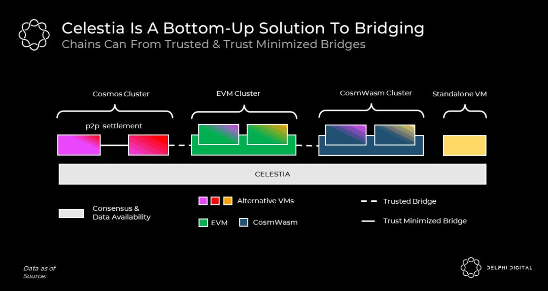 同时我认为这些 App-chain 中的 App-rollup 很多都会变成 Sovereign Rollup. 那么它们就没有了以同一个 Layer1 底层搭建自带的 Trust-minimized 桥梁 (或者), 从而以其作为互通层. 它们需要通过 Cevmos 等架构来通过 Trusted Bridge 与其他 Cluster 或者带 IBC 网络实现互通, 架构上没那么简洁, 同时概念也比较新。