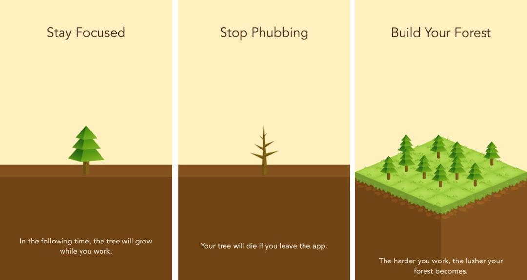 用户通过种植一棵树来开始注意力集中的训练。当用户在工作时,这棵树会生长,如果用户在时间结束前离开应用程序,这棵树就会枯萎。