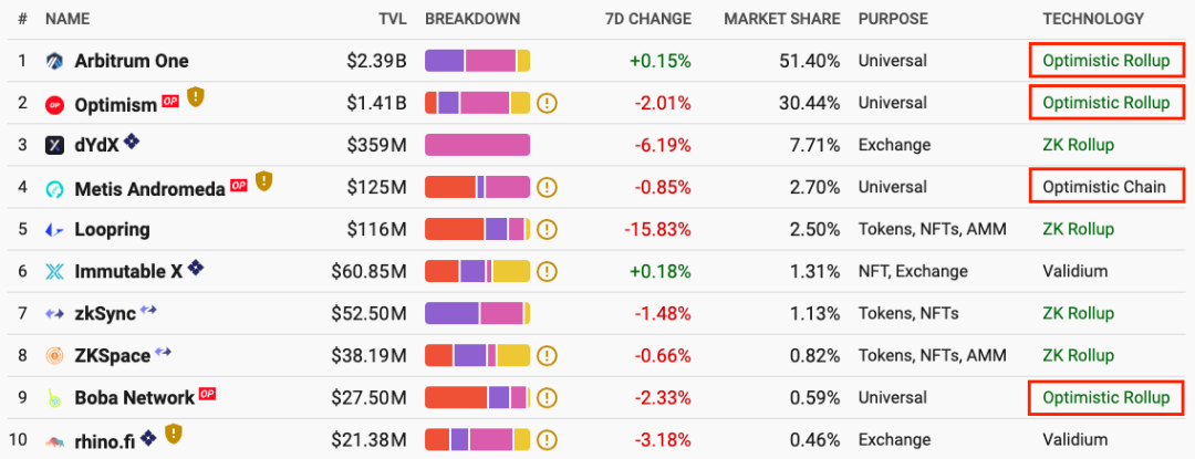 尽管 Vitalik 早在几年前就认定了 zkEVM Rollup 是未来, 同时各家 zkEVM (Scroll, zkSync, Hermez, Consensys) 也如雨后春笋一般冒出来, 但Optimistic Rollup 仍是目前 Rollup 生态的绝对主力, 拥有 80% Layer2 的市场占有率以及前十 Layer2 方案的半壁江山.