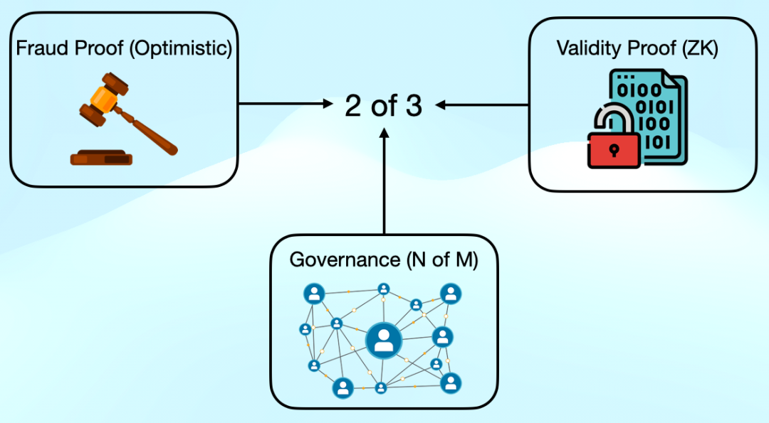 Vitalik 则完善了 Kelvin 的方案, 认为可以通过 (OP + ZK) + Governance 的 2 + 1 组合来实现可靠的 Rollup.