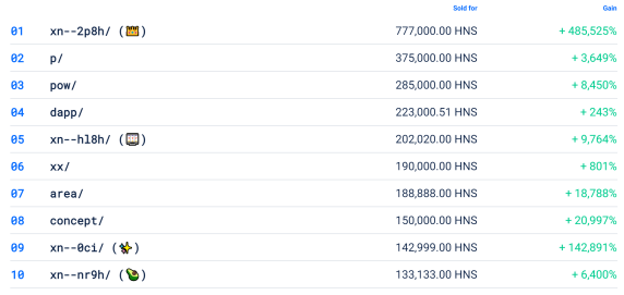 据 namebase 官网,pow/、dapp/域名最新成交价跻身历史前十位,pow/收益增幅达 8450%。