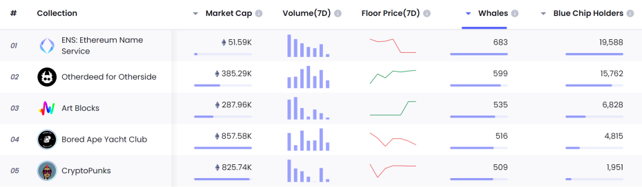 NFTGo 数据显示,ENS 颇受 NFT 巨鲸青睐。持有 ENS 域名的 NFT 巨鲸数量为 683,在 ETH 链上 NFT 项目中排名首位。(注:NFTGo 对 NFT 巨鲸的注释为持有价值超 100 万美元的 NFT 收藏者)