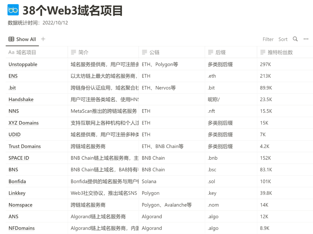 哔哔 News 整理了 38 个 Web3 域名项目,涉及近 30 条公链,以下是数据表格链接: