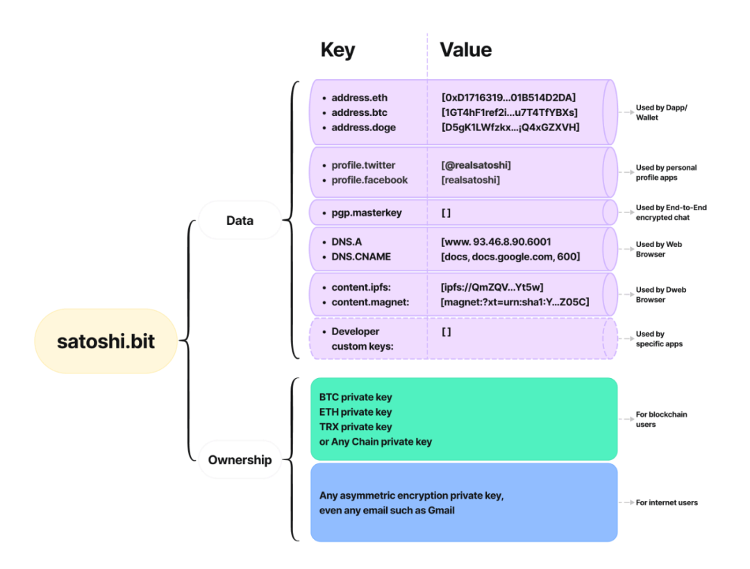域名包含数据和所有权,数据包括钱包地址、社交媒体账号、点对点加密通信账号、网络浏览器、去中心化网站等,所有权则主要是私钥。
