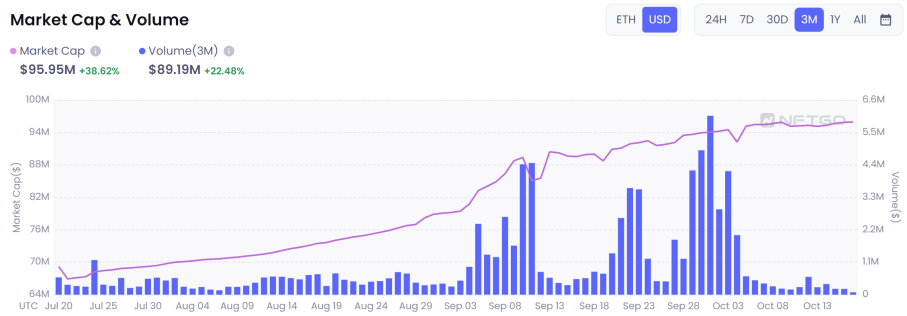 NFTGo 数据显示,最近三个月 ENS 交易量为 8919 万美元,环比增长 22.48%,市值达 9595 万美元,环比增长 38.62%。