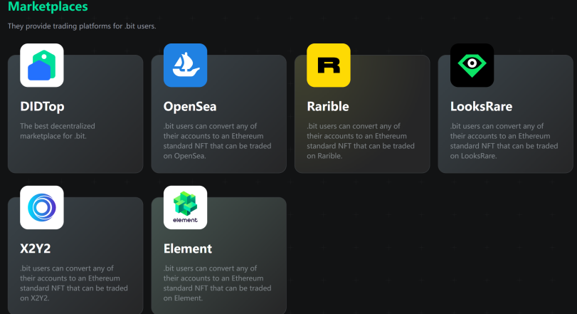 用户可在 6 个 NFT 市场交易.bit 域名:DIDTop、OpenSea、Rarible、LooksRare、X2Y2、Element。