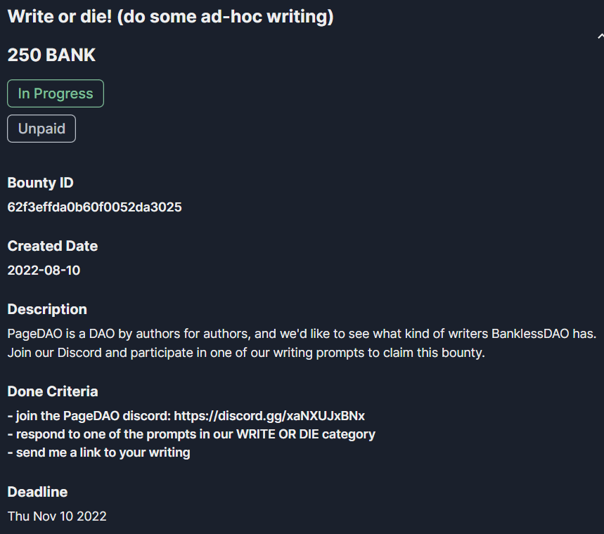 在 Bankless 的赏金任务板上,有许多这样的任务。在这个任务中,写作者可以向 PageDAO 报道并发一篇自己历史文章,任务赏金是 250$BANK,而一个 $BANK 大概是 2.25 美元,换算成人民币大概 3500 元。