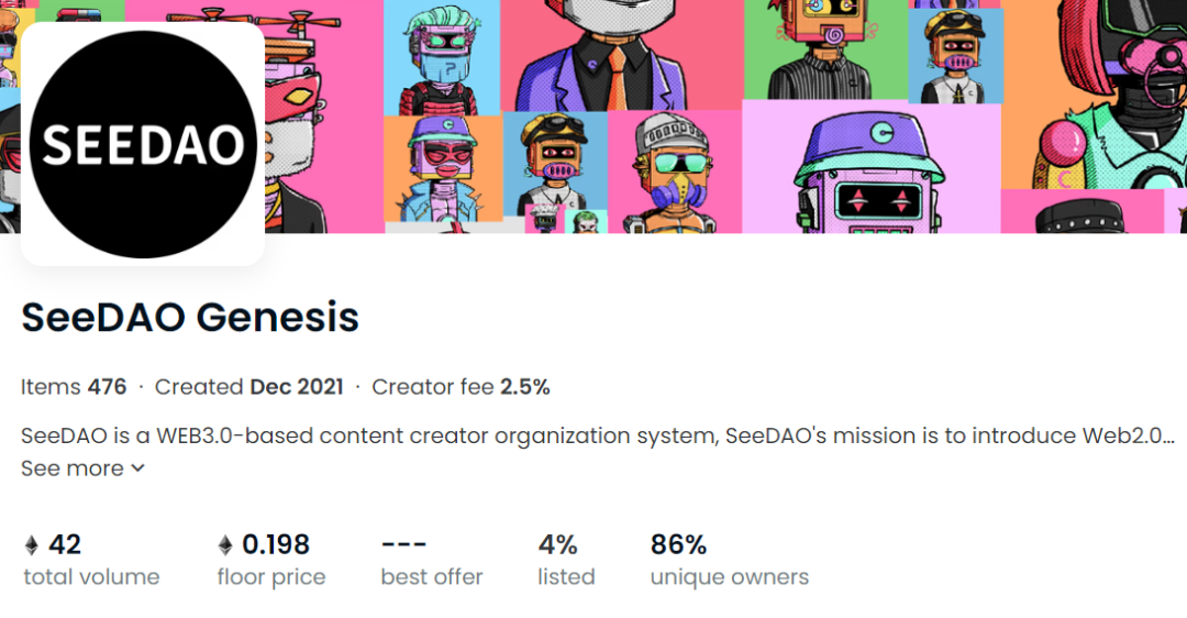 截至发稿前,SeeDAO 的系列 NFT 地板价 0.198 eth,换算成人民币大概是 2000 元,有些 NFT 可以达到 7-8 eth。