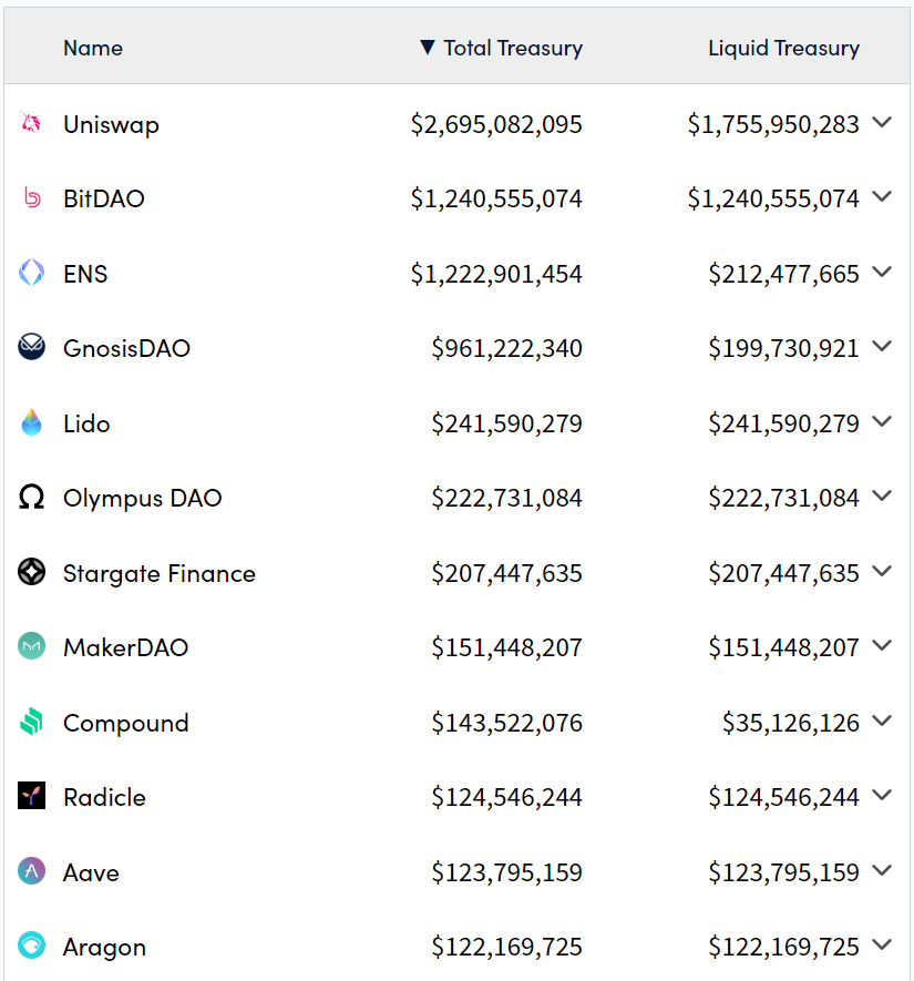 目前,DAO 财库超过 10 亿美元价值的有四个: Uniswap、Bitdao、Gnosis、ENS,还有 stargate 等 8 家个项目财库超过 1 亿美元。
