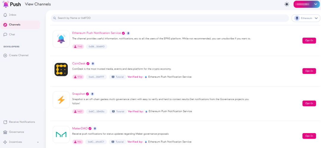频道板块则聚集了各个 DAPP 频道,DAPP 通过这种方式向订阅地址传达重要的进展,例如 MakerDAO 通过频道让用户知道治理提案的状态更新。