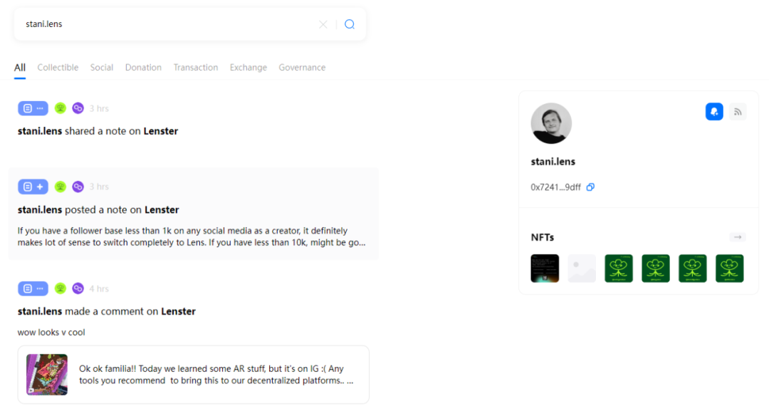 RSS3 是一个比较好用的 Web3 搜索引擎。你在这个平台搜索 stani.lens,可以查到 Stani 的所有藏品,社交、捐赠、治理及交易记录。并且信息都是以易读的方式呈现。
