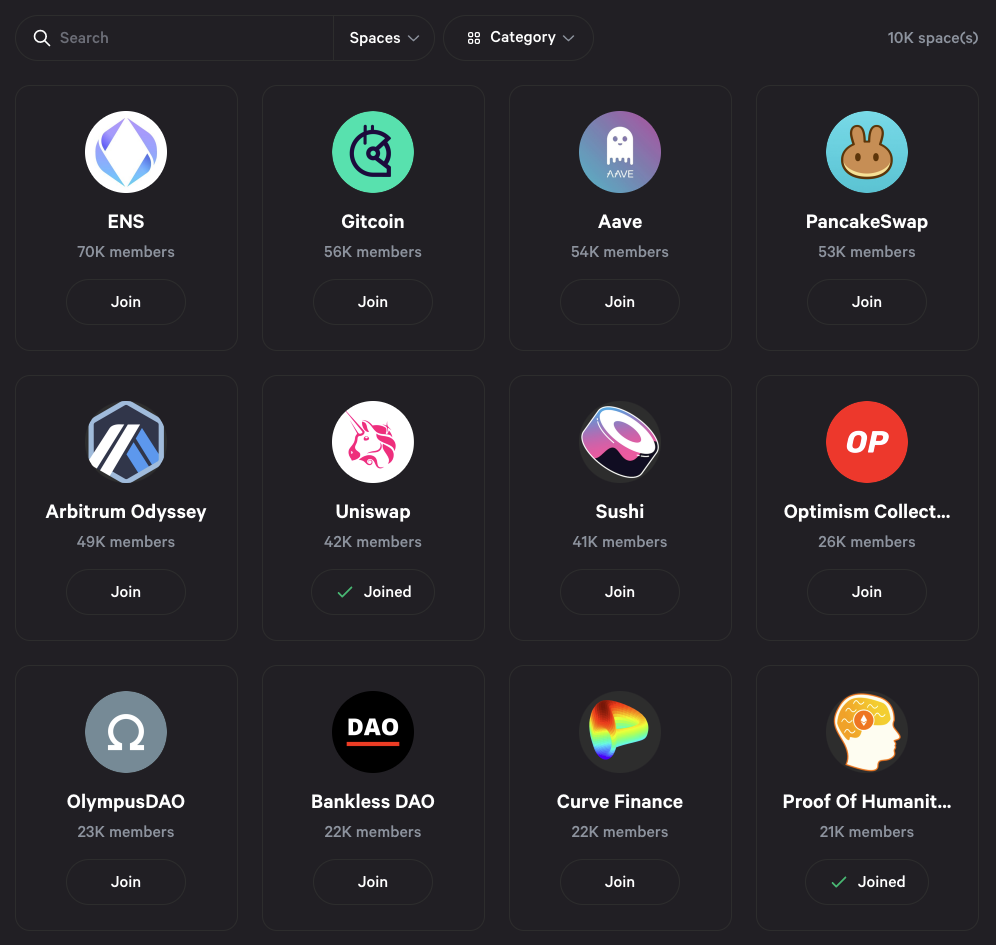 DAO 成员也可以搜索他们喜欢的 DAO,加入并参与他们有资格参与的任何投票过程。目前已有一万多个来自不同区块链的 DAO 加入了 Snapshot,其中不乏一些较大的 DAO,如 Uniswap、Aave 和 ENS。