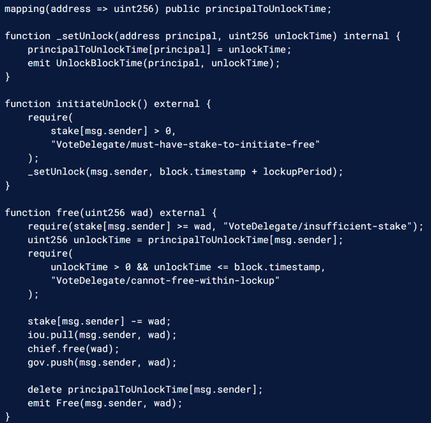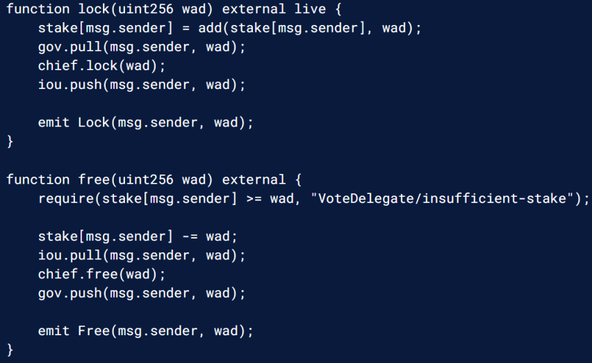 我们使用 Maker 合约进行演示。大多数核心委托逻辑都存在于 VoteDelegate.sol 合约中,特别是注意 lock 和 free 函数,它们完全能够满足要求。代币持有者使用 lock 函数来捆绑代币并分配其治理权,并使用 free 函数收回这些代币和相关的治理权。