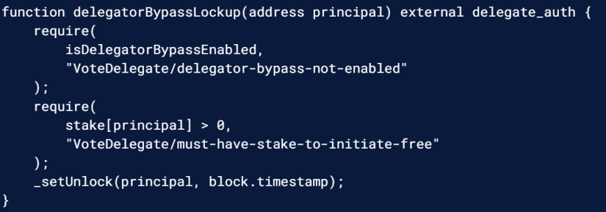 首先,受托人和代币持有人可以相互同意结束委托关系。在这种情况下可以提供绕行功能,这可以通过一个简单的函数 delegatorBypassLockup 来实现,它可以让委托人毫不拖延地放弃治理权。(请注意,参数 isDelegatorBypassEnabled 可以在合约启动时启用此功能。)