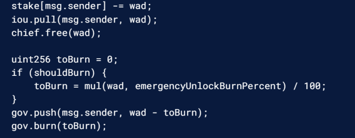 一种好的解决方案是允许代币持有者通过不可撤销地销毁代币来绕过锁定期,这就很容易实现。初始化合约时,代币所有者设置了一个 EmergencyUnlockBurnPercent 值(可能高达 100%)。然后修改 free 函数来检查 token 持有者是否选择了紧急路由。如果是这样,它只会归还未燃烧的代币份额并燃烧剩余的份额。我们在这里展示了该逻辑的一部分: