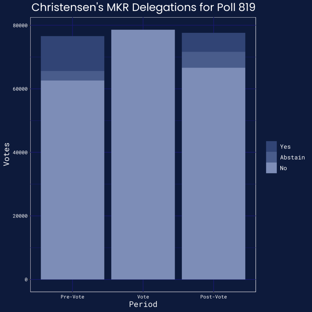 这表明在关键时治理提案可以绕过代币委托程序。例如 Maker 的创始人 Rune Christensen 在委托时期更改了提案授权,从而影响投票结果。虽然 Christensen 公开反对该提议,但他几乎将他所有的 MKR 代币都委托了出去。但在为期两周的投票窗口期间,他撤销了投赞成票或弃权票的代表的授权,并将这些代币重新授权给其他没有投票的代表。这种重新分配似乎只是为了掩饰 Christensen 和投赞成票的代表之间的根本分歧的一种战术。在投票结束后的三天内,Christensen 再次将代表权转回给在上次选举中投赞成票的代表。这种模式如下图所示: