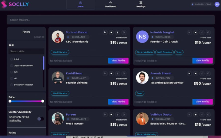 Soclly 自称是一个由 Lens 协议提供支持的的、以创作者为中心且专注于社区去中心化社网络。创作者或者资深人士在平台上完成注册后可以添加自己的技能和经验,以及设置可用时段和费用,然后帮助其他人解决问题。请求者可以去预约选定创作者的时间(半小时),预约时需要付费,预约成功过资金就会转入创作者钱包,之后就可以在约定的时间与创作者进行会议。Soclly 上的通信由开源隐私 Web 会议应用 Jitsi 提供支持。