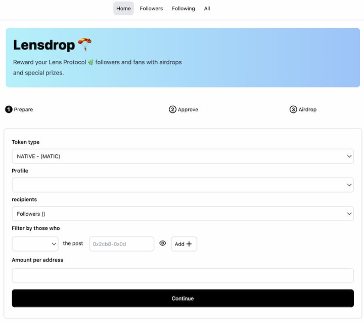 Lensdrop 允许创作者用空投或者一些代币其在 Lens Protocol 上的粉丝。