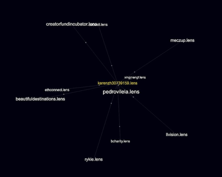 CultivatorLens 是一个可视化社交图谱浏览器和工具,在输入 Lens Profile handle 之后可以查看相关 Profile 的社交图谱,能够发现我们与他人共同拥有的追随者,并了解相互联系程度。