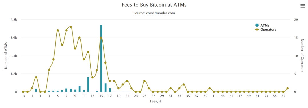 图表:只有 22.2% 的加密币 ATM 支持法币出金和提款服务;加密币 ATM 的费率大多在 5% 到 20% 之间