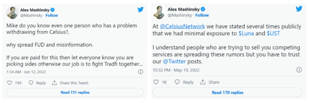 首席执行官亚 Alex Mashinsky 在推特上发布的导致 Celsius 崩溃的消息都是故意误导。这可能,至少,相当于违反了他对 Celsius 所承担的受托责任。还有人说,Mashinsky 直接告诉公众,Celsius 对 UST 的敞口很小——事实并非如此,因为它是影响 UST 与美元脱钩的最大钱包之一。