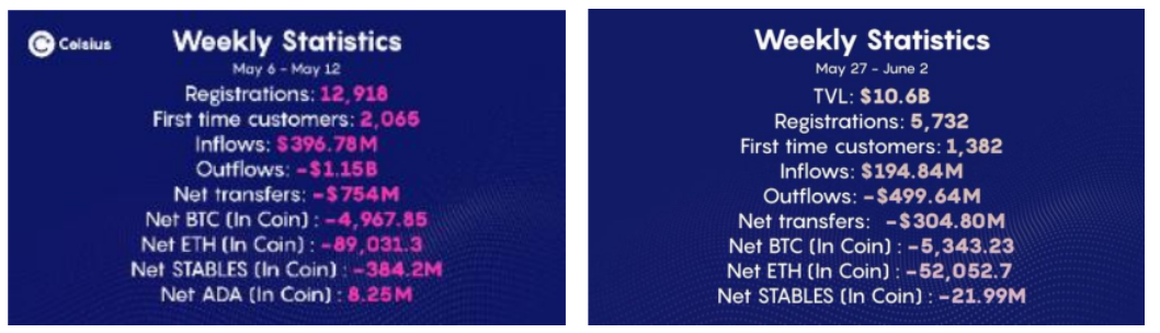 以上数据是在 6 月 12 日冻结客户账户之前,Celsius 提供的最后一周统计数据。5 月 6 日至 5 月 12 日这一周出现了大规模的资金流出和负持仓。