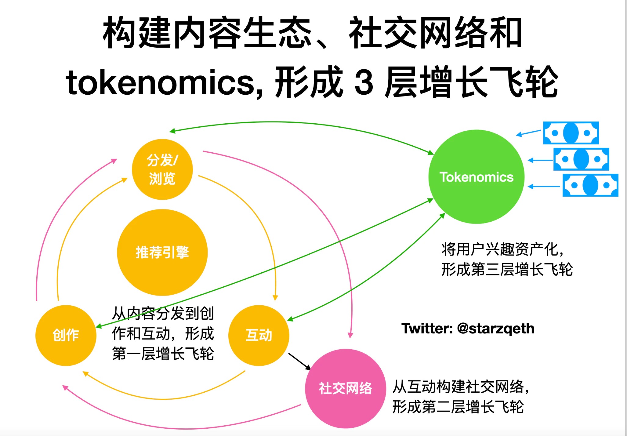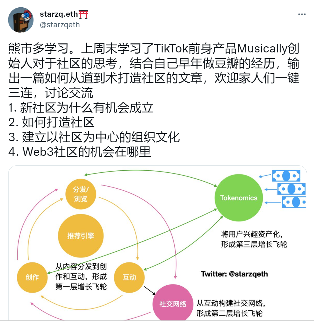 这个共赢关系会激励用户在社区有更多行为,合理的 tokenomics 设计可以支撑起这个关系,带来推荐引擎和社交网络之外的第三层增长飞轮
