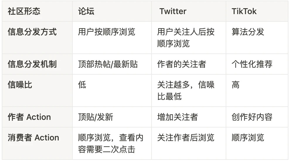对比典型的三种社区形态,论坛里面只有顶部热帖和最新贴有机会被看到,所以作者要么不断顶贴,要么不断发新;Twitter 这类社交媒体,只有 follower 可以看到作者更新,作者需要想办法增加关注者,回到了一个鸡生蛋还是蛋生鸡的问题;抖音/TikTok 采用了算法分发,作者只要写好内容就可以获得个性化推荐,大大降低了分发门槛。同时对于消费者,在个性化推荐下,进行顺序浏览就可以看到信噪比高的感兴趣内容,提升了消费内容的频次和数量。