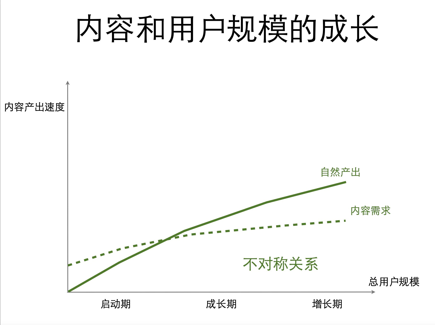 - 增长期:自然产出 >> 内容需求,核心工作是如何高效分发高质量内容,提升用户规模