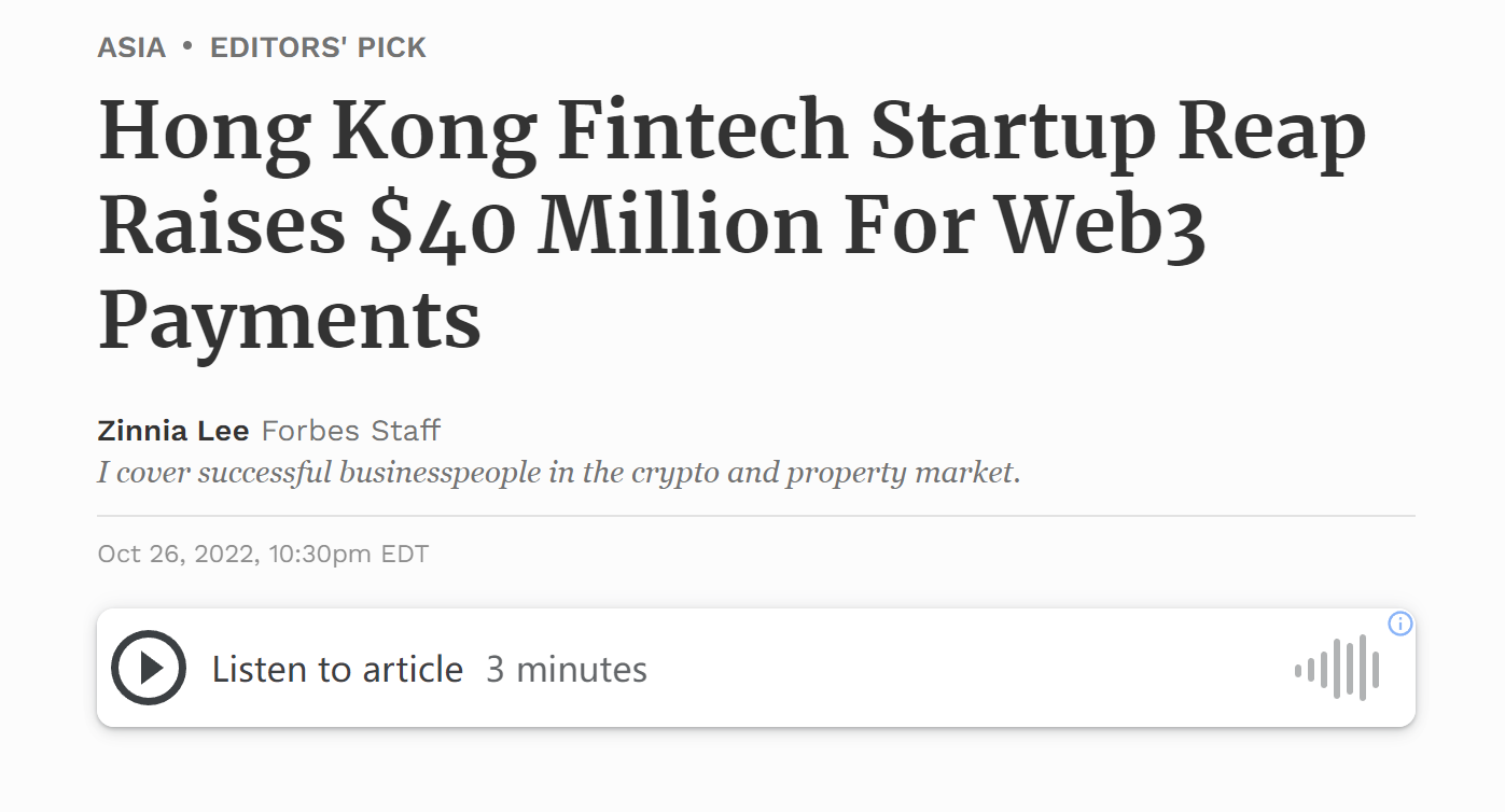 - 香港 Web3 支付公司 Reap 完成 4000 万美元融资 ,HashKey Capital、Acorn Pacific 等领投