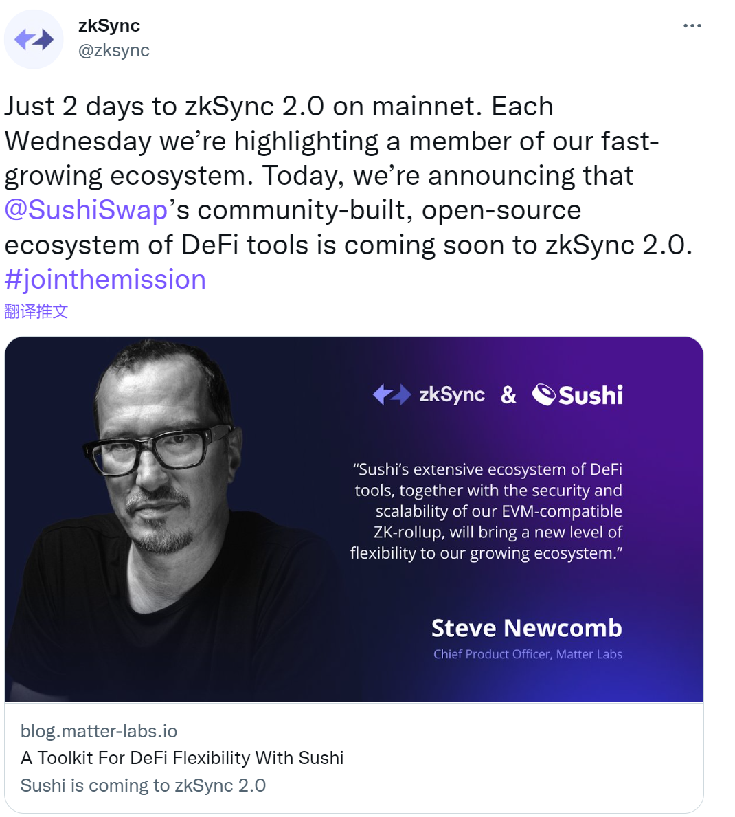 - Sushi 生态将与 zkSync 2.0 集成,以拓展其生态灵活性