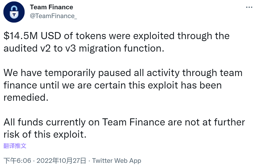 - Team Finance 团队:该协议管理资金在由 Uniswap v2 迁移至 v3 的过程中遭到黑客攻击 ,已确定的损失为 1450 万美元