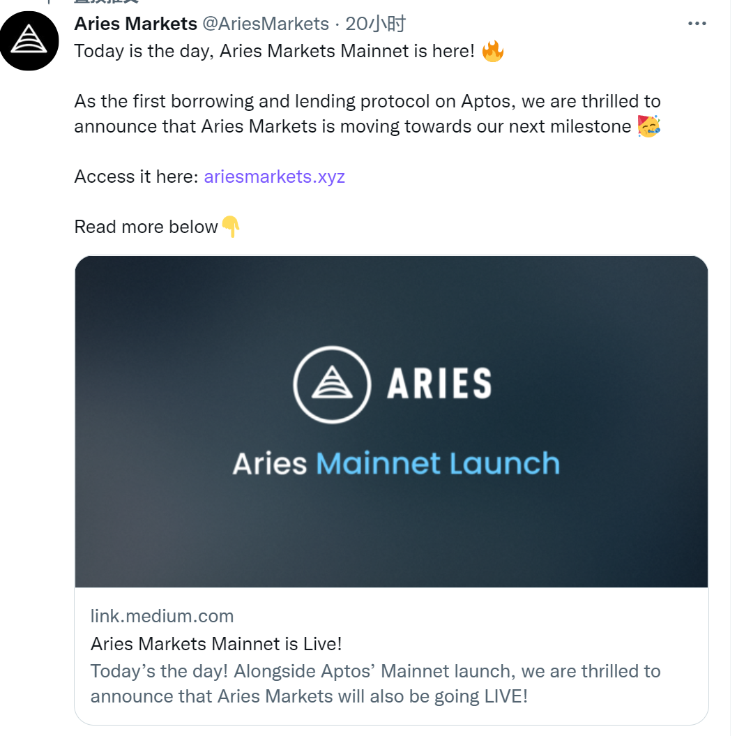- 去中心化借贷协议 Aries Markets 已在 Aptos 区块链主网上线