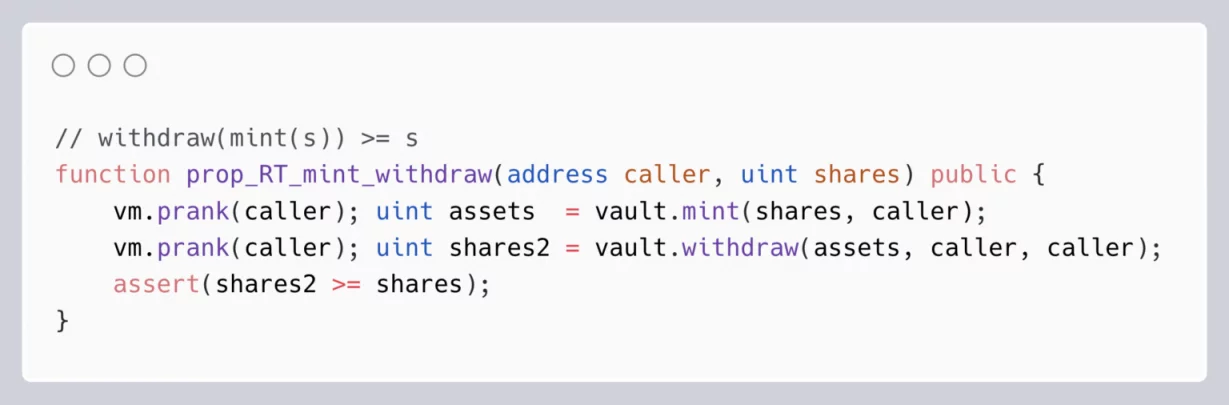 我们将舍入相关属性编写为独立于基础会计逻辑,并将其视为「黑匣子」。具体来说我们将它们表述为所谓的「往返」属性,它描述了两个相反函数之间的关系。例如以下属性规定,通过铸造 N 股来提取刚刚托管的资产必须燃烧不少于 N 股。换句话说,没有人可以通过反复铸造和提现来反复转换资产和金库代币来获利。