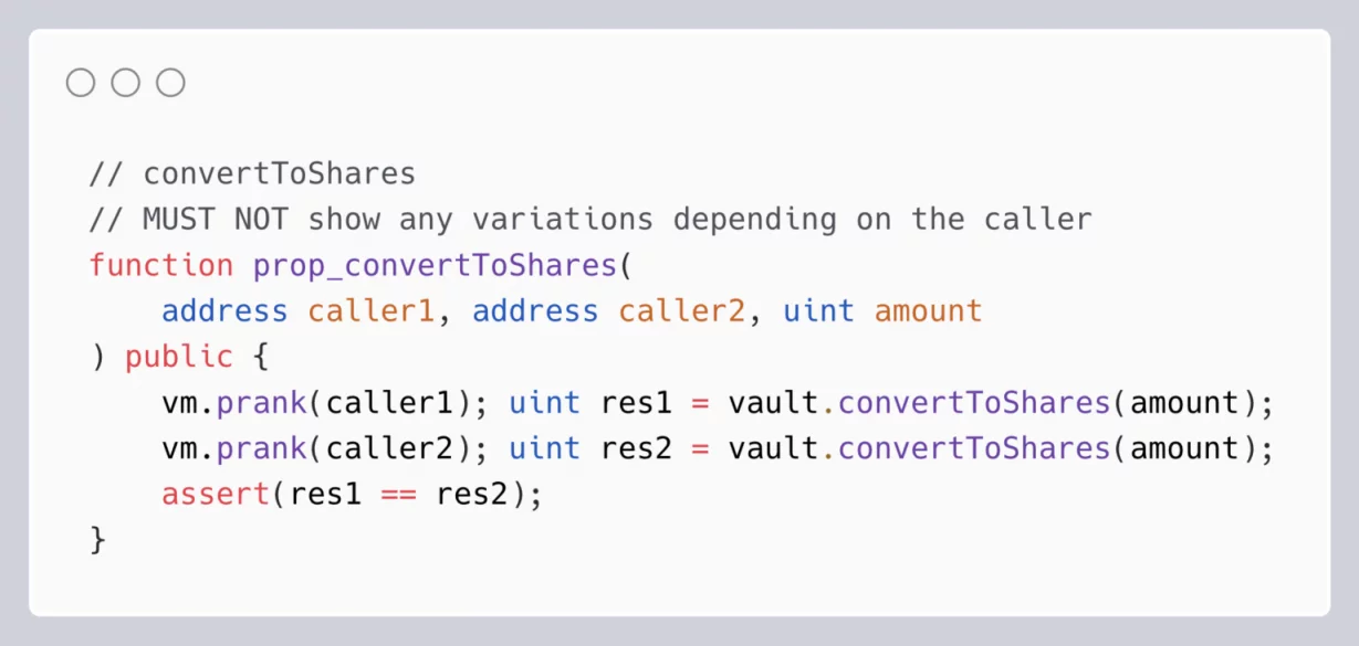 给定两个账户地址和金额,它使每个账户以相同的金额调用 convertToShares(),并确保两个返回值相等。此属性独立于实现细节 convertToShares()。这些细节因金库的不同而异,并且必须由任何实现 ERC-4626 的金库来满足。在这种情况下可以通过提供特定输入值(用于单元测试)、许多用于模糊测试的随机输入或用于符号执行和形式验证的符号值来执行此属性。它也可以在本地运行或针对主网分叉运行。