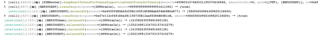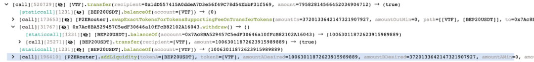 3、将 VTF 代币转给第一步生成的攻击合约0x1dD557,之后用部分 VTF 代币换回 USDT 后为池子添加流动性:
