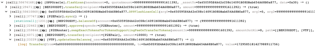 2、两天后,攻击者发起了正式的攻击0xeeaf7e96,攻击者首先闪电贷借出大量的 USDT,接着通过 pancake 将 USDT 兑换成 VTF 代币并调用 VTF 代币合约的updateUserBalance 函数获得分红奖励: