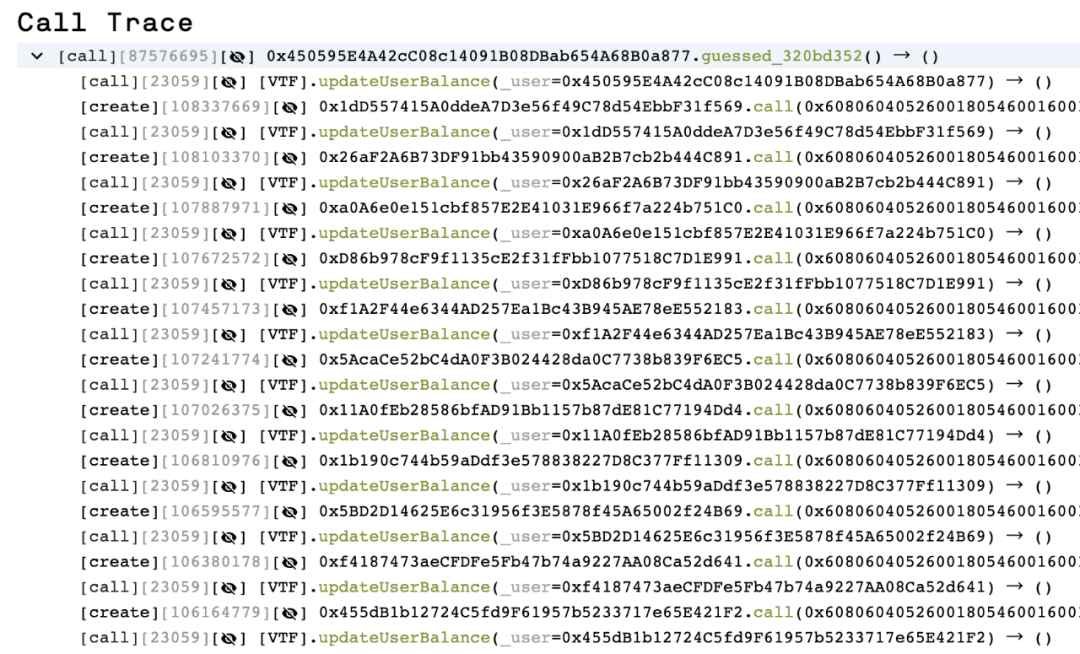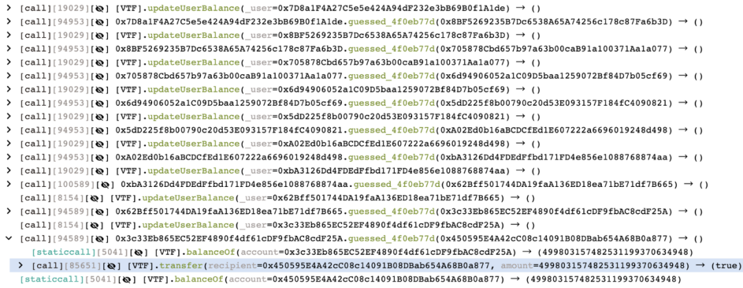 5、随后,攻击者将所有的 VTF 代币转移给下一个攻击合约,并继续调用updateUserBalance 函数分红奖励,循环该过程直到所有的攻击合约都获得奖励分红并不断累加 VTF 代币,最后一个合约将所有的 VTF 汇集转回给主攻击合约0x450595e4: