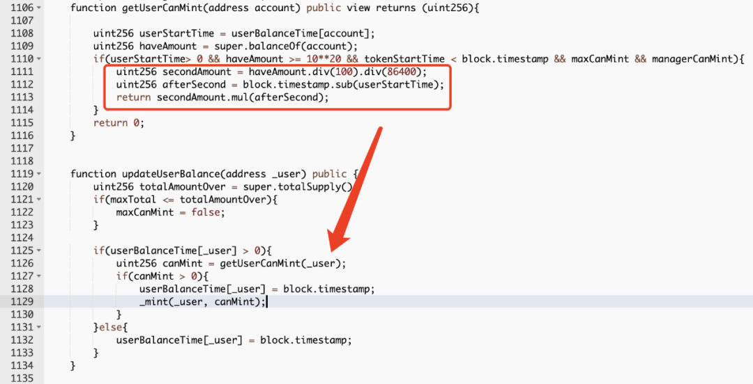4、接下来攻击者调用 VTF 代币合约的updateUserBalance 为攻击合约0x1dD557 分红奖励,由于正式攻击与之前第一笔准备攻击的交易相隔两天,所以userBalanceTime 与当前时间戳具有两天的差值而不会为 0,从而通过了检查并且计算奖励的数值为账户中的 VTF 代币余额与时间差值相乘的结果,以此成功获得分红奖励:
