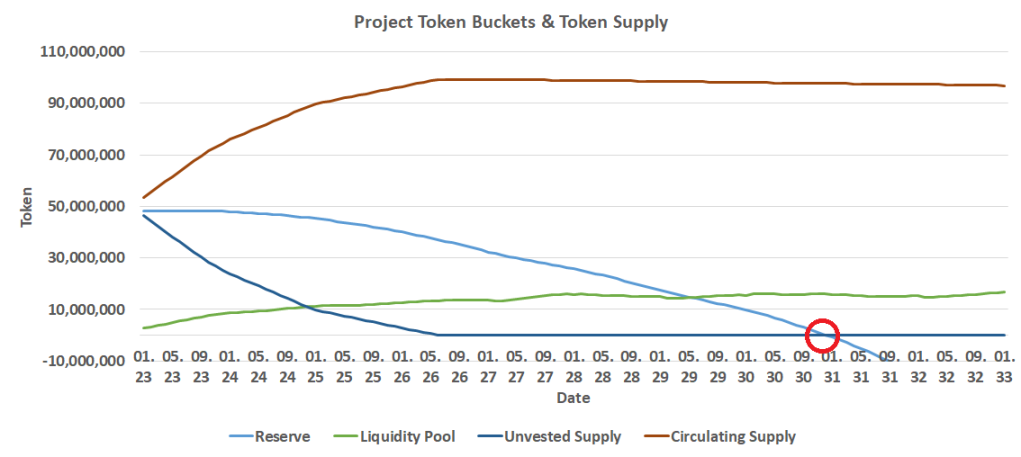对于较小市值的代币,宏观市场情绪通常表现为较高的波动性,因此加密市场熊市起到了加速淘汰有缺陷的小市值加密公司的作用。虽然代币价格下跌并不是 Web3 企业唯一担心的问题,代币的价格行为本身并不能代表整体价值捕获的能力,但它是一个重要市场指标。图 4 显示了 Web3 业务的简化量化代币模型示例的结果。红色圆圈表示公司储备在大约 8 年后耗尽代币的时间点。这是固定供应代币设计的典型案例,但并没有通过代币工程方法进行适当的数值预测。