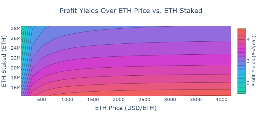 为了在不同角度和假设下检查 L1 区块链,CADLabs 开源以太坊 radCAD 模型 [7] 做过许多预设实验。通过将模型的给定合并 [8] 日期调整为过去的某个日期,以太坊基金会可以显示所有权益证明 (PoS) 验证者在网络中抵押的 ETH 总量和以美元计价的 ETH 价格不同的情况下的预期利润率,如图 5 中的颜色映射所示。
