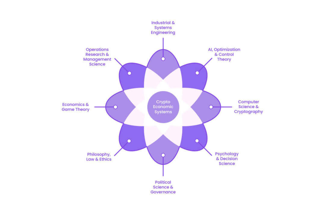 图 1 描述了代币工程师在分析加密经济模型时必须使用的一些不同学科。本文中「代币经济」和「加密经济」为同一个含义。