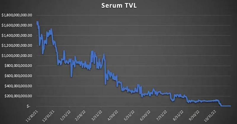 许多DeFi 协议在FTX 之后受到了严重影响,其中与Alameda 关系密切的项目受到的打击最为严重。其中最值得注意的是Serum,这是一个基于订单簿的DEX,其治理代币SRM,已经成为 “低浮动,高FDV(完全稀释估值)” 代币设计的典范,使公司能够以虚高的估值利用代币获得大量贷款。即使在过去三周半的时间里价格下跌了69.2%,SRM 仍然以24 亿美元的FDV 交易。
