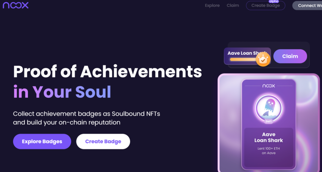 Noox 是一个供 Web3 用户基于链上行为铸造徽章来证明成就的平台。应用程序或者社区策划者可以在徽章中编入任意规则,例如交互数量,金额等,用户通过 Noox 平台发现相关活动后,可以进行钱包链接,在符合条件的情况下进行铸造。