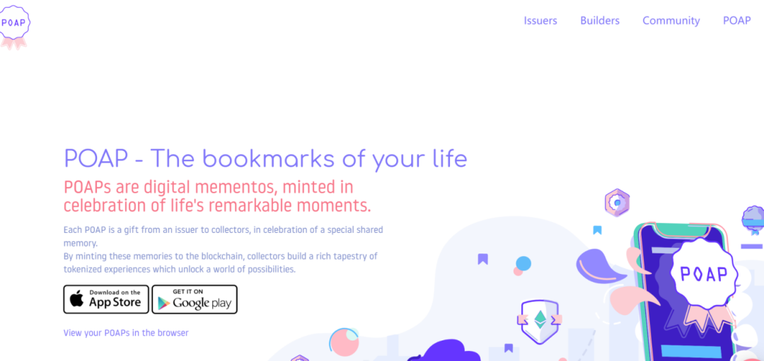 POAP,即 “Proof-Of-Attendance Protocol(出席证明协议)”,通过分发加密徽章的机来记录和纪念特定事件的发生,由此生成参与者的在场凭证。