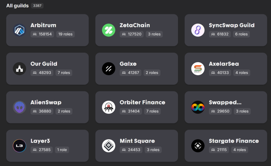 Guild 是一个基于 DID 的门控类应用。通过 Guid 平台,可以设置 Discord 或者 Telegram 的进入条件,比如持有哪些 token,哪些 NFT 等。目前已经有基于众多项目的 3000 多个门控任务,知名的 Layer2 Arbitrum 的最新角色任务就是通过此平台进行。